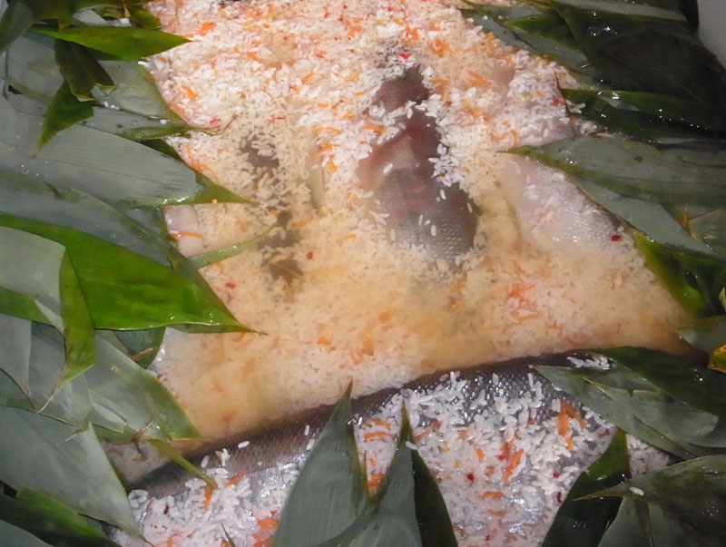 腹にしっかり詰め込んだ後、ふたをし、表にもしっかりまぶし漬込みます。