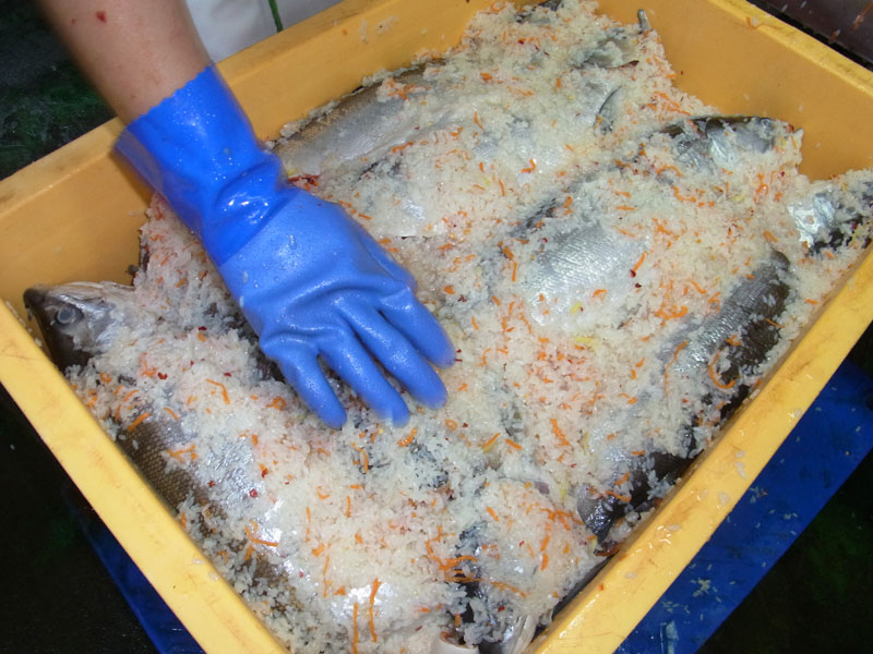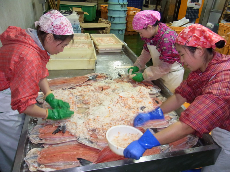 塩、酢で漬け込んだ鮭に、麹、野菜などで味付けしたご飯を混ぜていきます